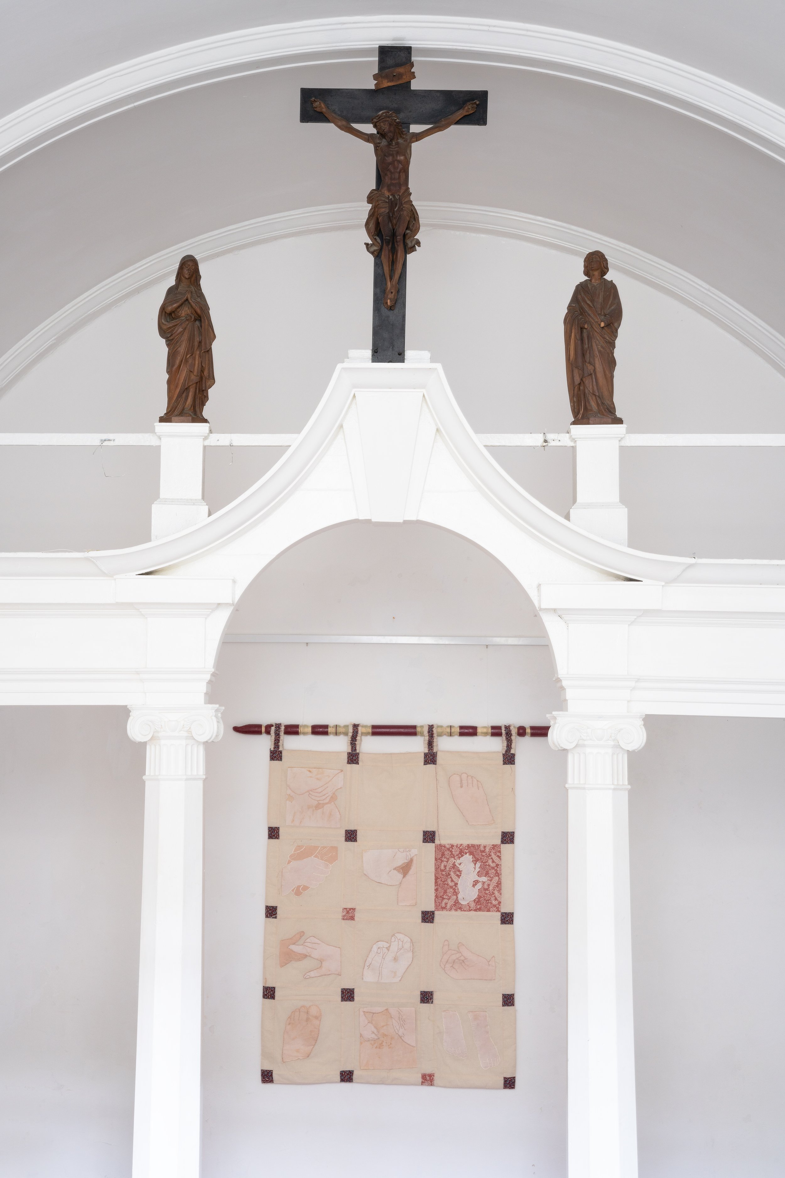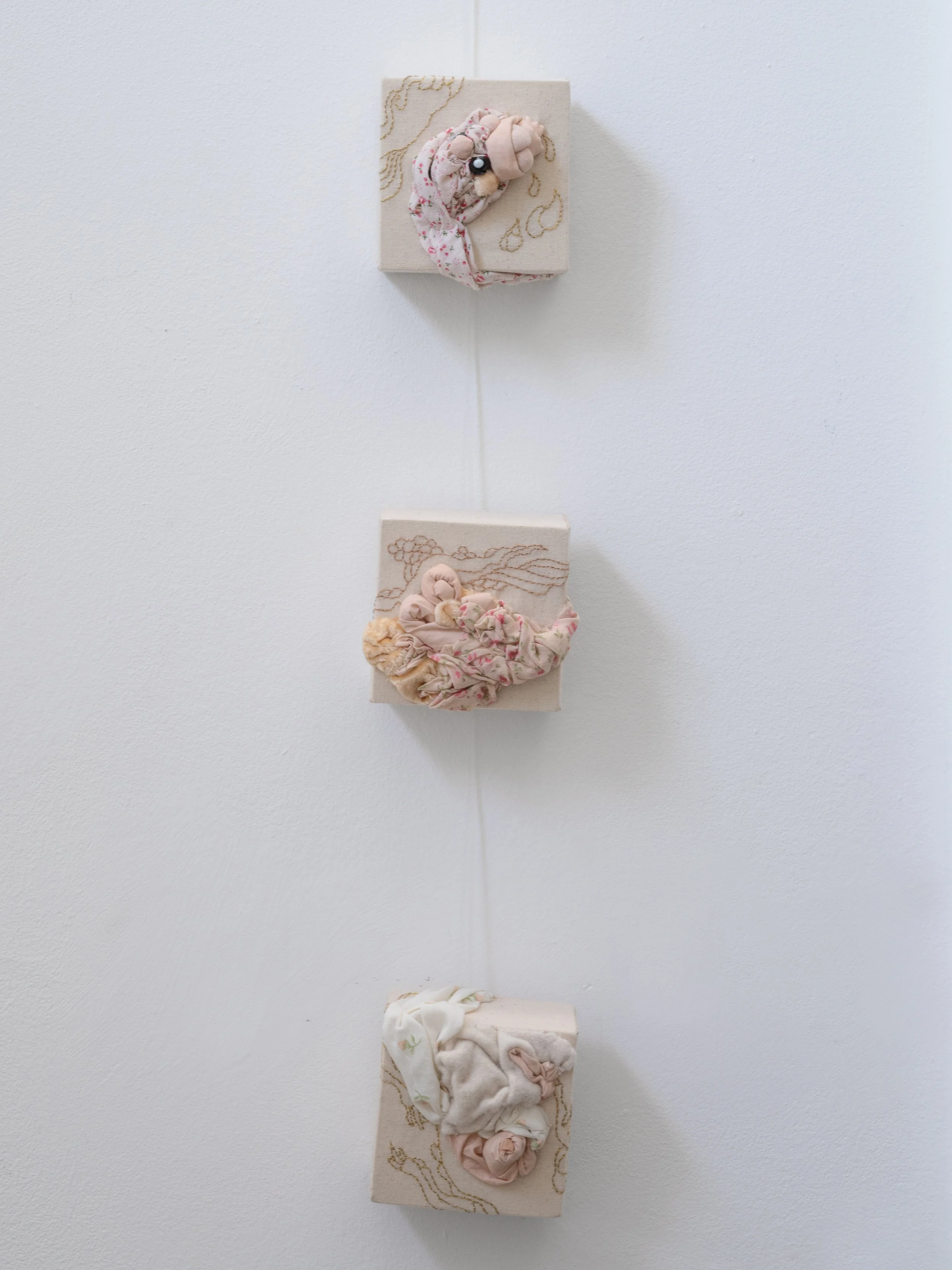 The search for textiles becomes a challenge as Spowart uses textiles from Uzbekistan, her homeland. Sewing becomes the artistic meditative process and evolves around labour-intensive, contemplative practices to show the tactile nature and unbreakable bond between a mother and her children.